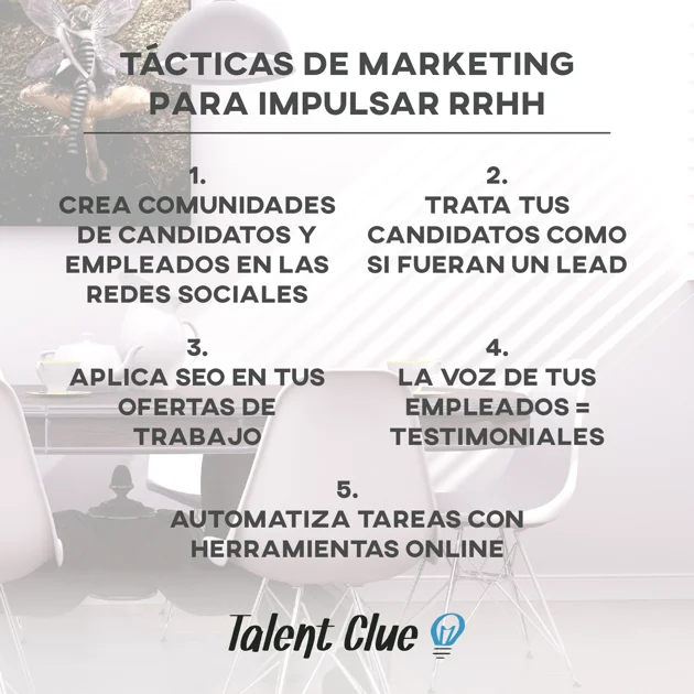 Marketing y Recursos Humanos tienen objetivos parecidos: el primero tiene que encontrar y conquistar potenciales clientes adecuados, el otro tiene que buscar y contratar potenciales candidatos para cubrir las necesidades de la empresa. Ambos tienen como misión principal hacer que la empresa crezca y sea atractiva, tanto para clientes como para los profesionales.